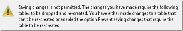 Эта ошибка связана с настройкой “Prevent saving changes that require table re-creation” SQL Management Studio, включенной по умолчанию, которую можно отключить в меню Tools –> Options, дальше нода Designers –> Table and Database Designers.
