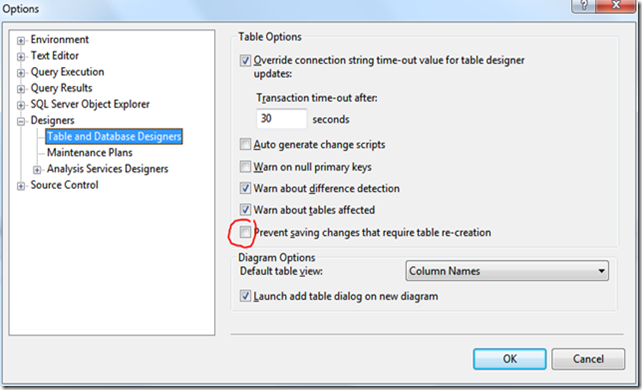Ошибка сохрнения изменений, требующих пересоздания таблицы в БД – SQL Server 2008 Management Studio